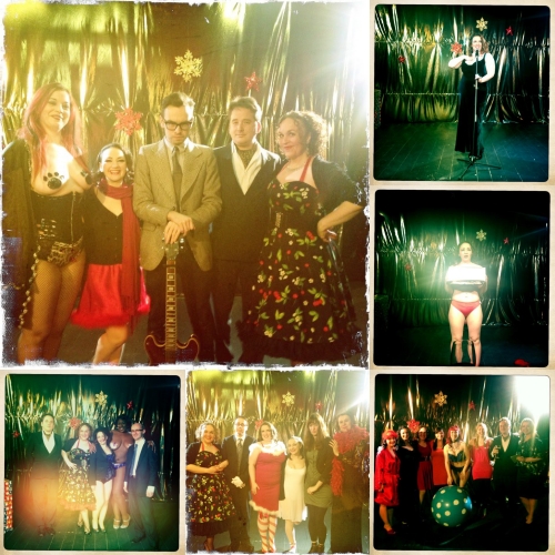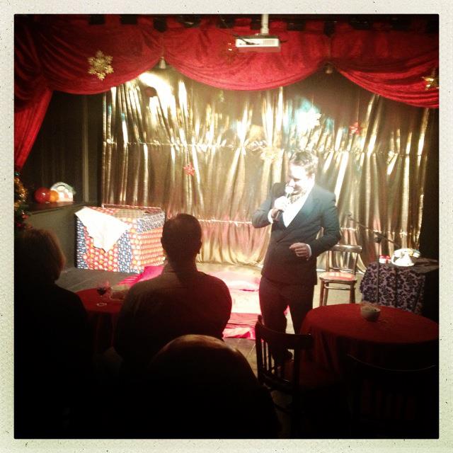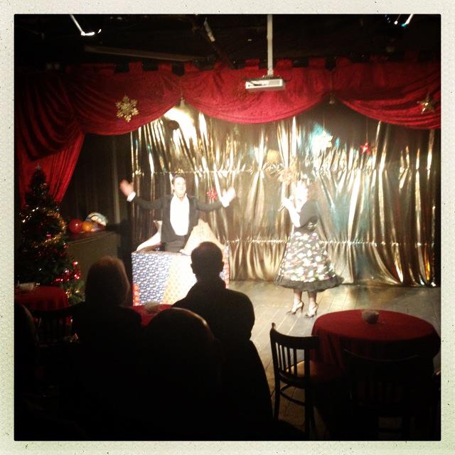 The plan was for Harvey to hide in the present just before we let in the audience, and shortly after Gemma had whisked on to stage she would reveal what was in her box. Then Harvey would jump out and surprise the audience and do a bit of a striptease skit with Gemma to warm them up for a burlesque act. This was all well and good in theory.